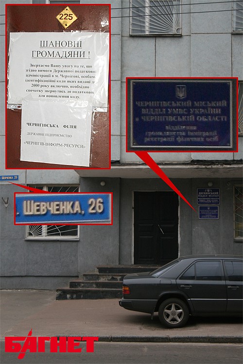 На вопрос об оформлении документа за 30 дней сотрудник областного ГИРФЛ ответил лаконично: «Не срочный – 600 грн. на ул. Шевченко, 26 (городской ГИРФЛ – Ред.)». Кстати, по адресу Шевченко, 51-А, согласно данным Госкомстата, значится черниговский филиал ГП «Документ». Но, ни вывески, ни каких-либо других признаков этой конторы там не обнаружилось.