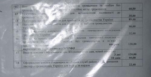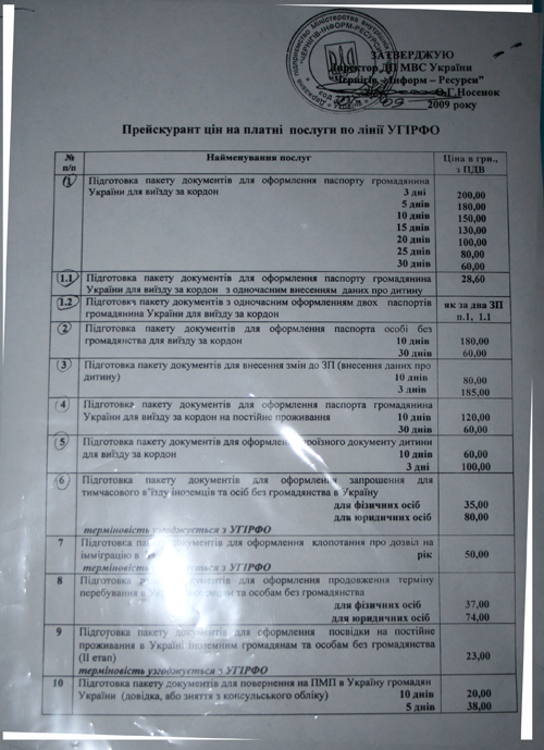 Более того, на информационной доске висит прейскурант этой структуры с печатью предприятия. Гендиректор «Чернигов-Информ-Ресурсы», некий О.Г. Носенок официально подписывает этот прейскурант и указывает, что это цены на услуги по линии ГИРФЛ, то есть паспортного департамента МВД. В прейскуранте приводится услуги на ВЕСЬ перечень, оформляемых через паспортистов документов. Среди прочего и стоимость услуг по подготовке пакета документов для оформления загранпаспорта (см. ниже фото документа).