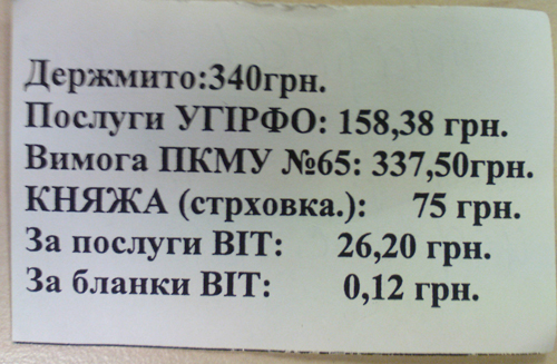 И о чудо! Сотрудница ГИРФЛ выдает бумажный корешок, на котором напечатаны необходимые платежи, а на обратной стороне от руки указано, что надо перечислить двумя платежами на «Информ-Ресурсы» 180 грн. и 80 грн. (см. ниже фото).