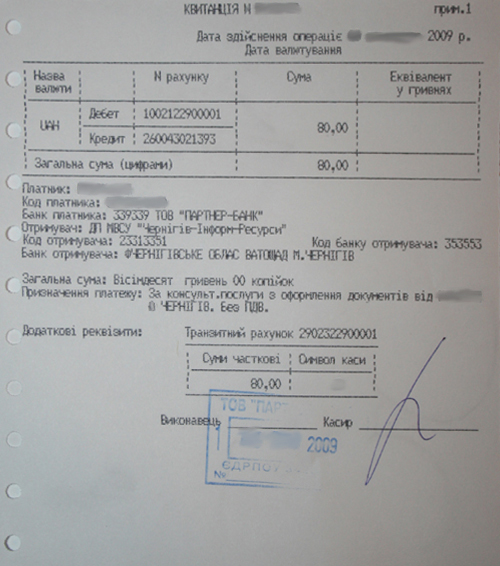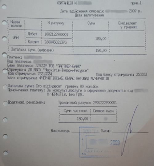 Согласно квитанциям (см. ниже фото) оба платежа пошли в адрес «Чернигов-Информ-Ресурсы» за консультационные услуги по оформлению документов. Что за консультационные услуги? Устное информирование граждан о стоимости оформления загранпаспорта, как это делается в кабинете №225? Или услуги согласно прейскуранта, размещенного на информационной доске в паспортном департаменте? Но там речь шла о какой-то подготовке пакета документов для оформления загранпаспортов.