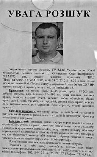 Объявления о пропаже Семинского висят на каждой станции метро: 38-летний Олег Семинский был одет в модельную норковую шапку и кожаную куртку с воротником из норки фирмы Zilli (одежду этого бренда носят мэр Киева Леонид Черновецкий и экс-президент Украины Виктор Ющенко. Куртки этой фирмы, по информации с официального сайта, стоят от $30 тысяч. — Авт.). Кроме того, на бизнесмене были ботинки 46-го размера темного цвета фирмы Gucci. «3 февраля в 18.30 в Киеве Семинский выехал на своем автомобиле Toyota Camry с паркинга по ул. Константиновская, 15», — написано в объявлении.