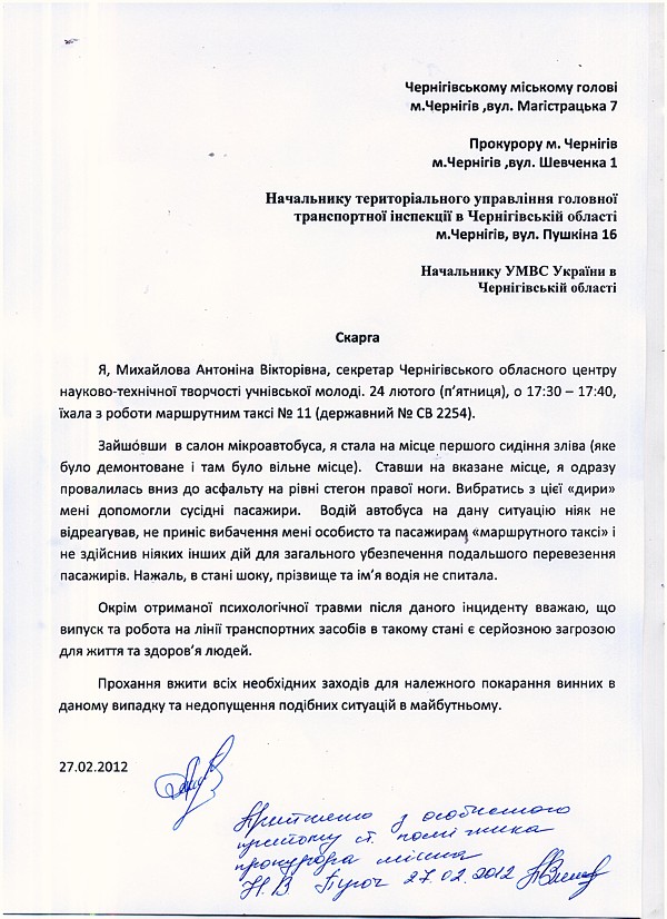 P.S. Для обсуждения транспортных проблем Чернигова и области, если Вам известны факты нарушения предприятиями-перевозчиками, просьба оставлять их на специально открытом форуме для обсуждения. Или передавать информацию по электронной почте [email protected], и звонить 093-118-44-38, (0462) 92-05-92.