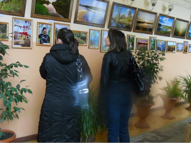 Еще две женщины в верхней одежде разглядывали выставку картин.