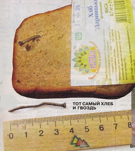 В мякише «Дарницкого» кирпичика от «Павы», отданного нам Людмилой Михайловной, торчал гвоздь. Старый, погнутый, со ржавчиной. Измеряли в редакции линейкой — 4 сантиметра. Гвоздь был ближе к основанию кирпичика, шляпкой вниз. Хлеб, где касался с гвоздем, потемнел, припекся, осталась вмятина. Людмила Михайловна кусок с гвоздем из хлеба вырезала и передала в редакцию.