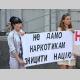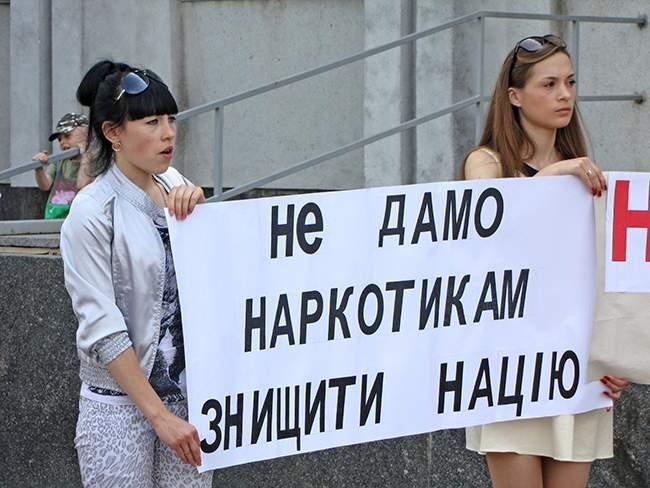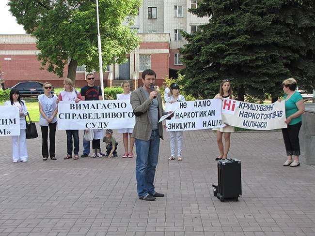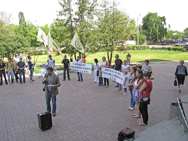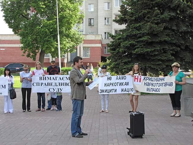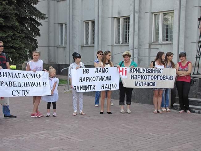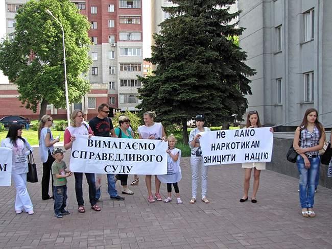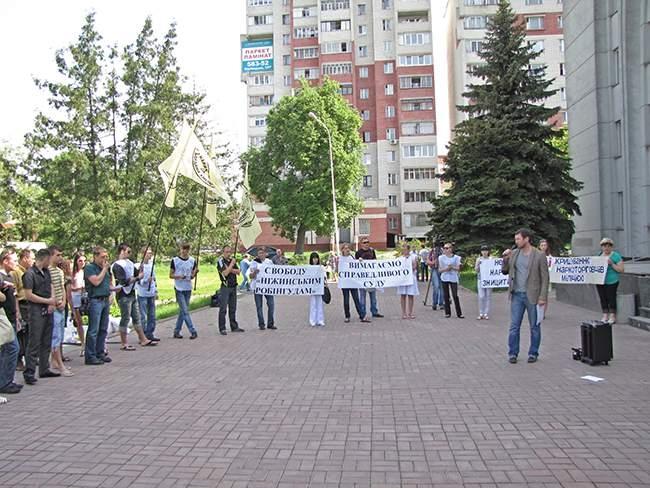 Участники акции держат плакаты: «Требуем справедливый суд», «Свободу «Нежинским робингудам», «Не дадим наркотикам уничтожить нацию», «Нет «крышеванию» наркоторговцев милицией».