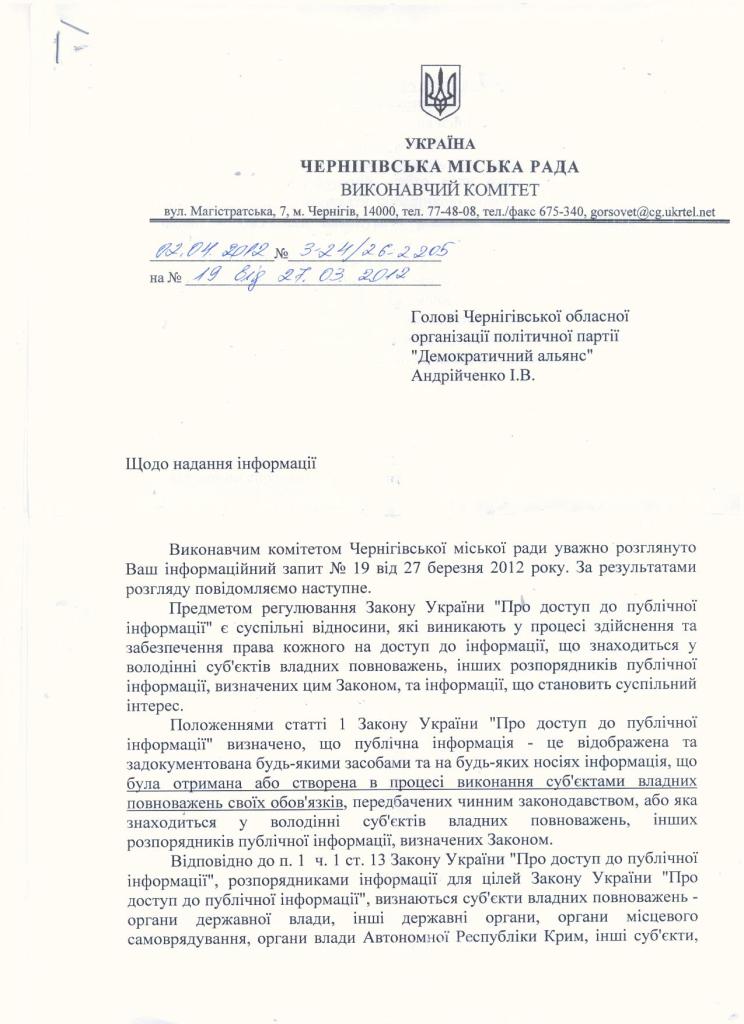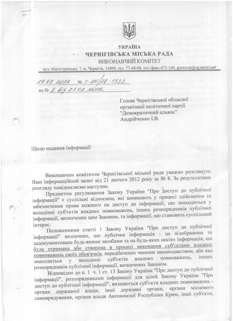В результате анализа полученных документов, Демократическим Альянсом направлена жалоба в Управление СБУ в Черниговской области и в Генеральную прокуратуру две жалобы. Первая по действиям городского совета, а вторая по бездействию местных органов Прокуратуры.