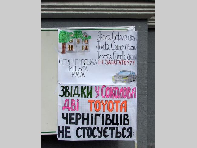 Напомним, что совсем недавно, Черниговской областной организацией Союза ветеранов афганцев, Черниговскому городскому совету был передан автомобиль Toyota Camry приблизительной стоимостью от 265 до 425 тысяч гривен. Как подчеркивают активисты Демократического Альянса – Александр Соколов занимает руководящую должность в этой организации.
