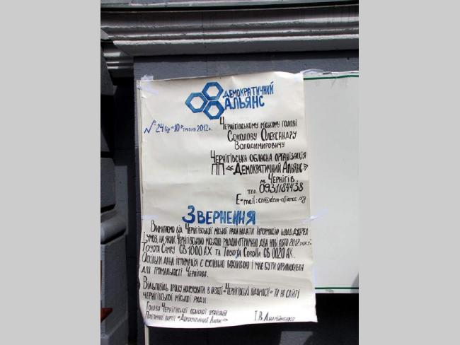 10 мая, под стенами Черниговского городского совета, активисты ПП «Демократический Альянс» организовали сбор подписей под Обращением к городскому главе Александру Соколову.