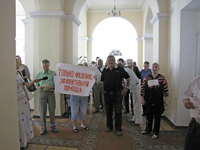 Протестующие требуют не переводить средства в отделение гемодиализа в областной больнице, а направить их в частную клинику, мотивируя это тем, что качество гемодиализа в областной больнице намного хуже, чем в клинике «Фрезениус».