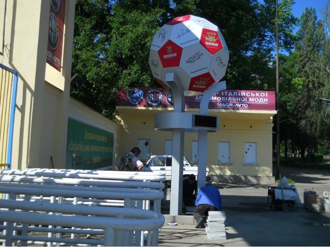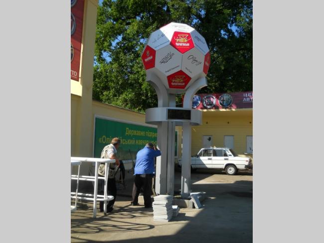 Возле стадиона поставили постамент с футбольным мячом (фотофакт)