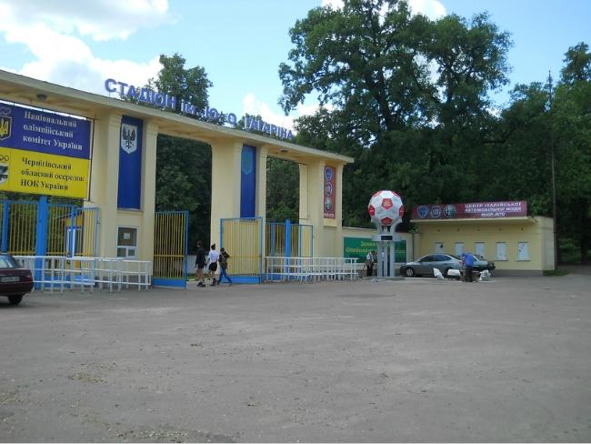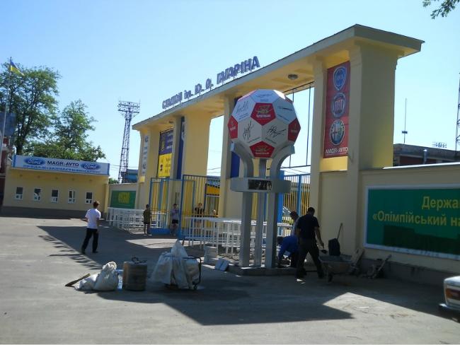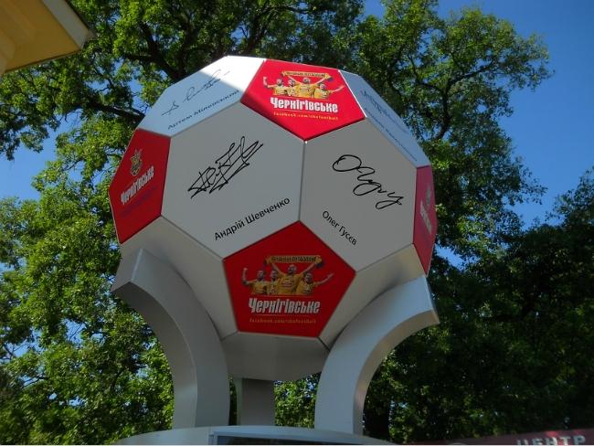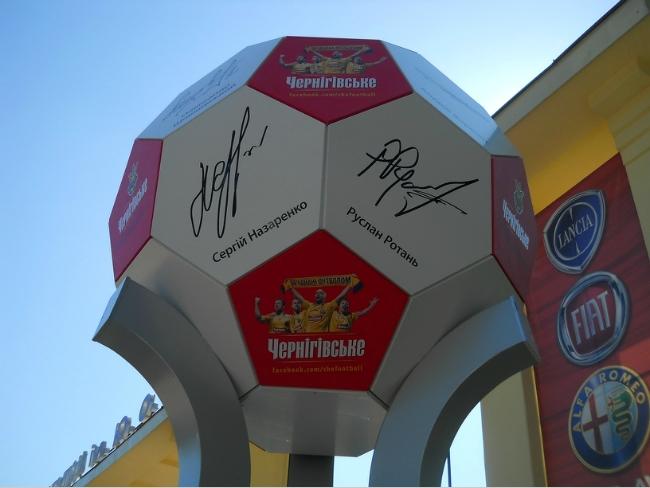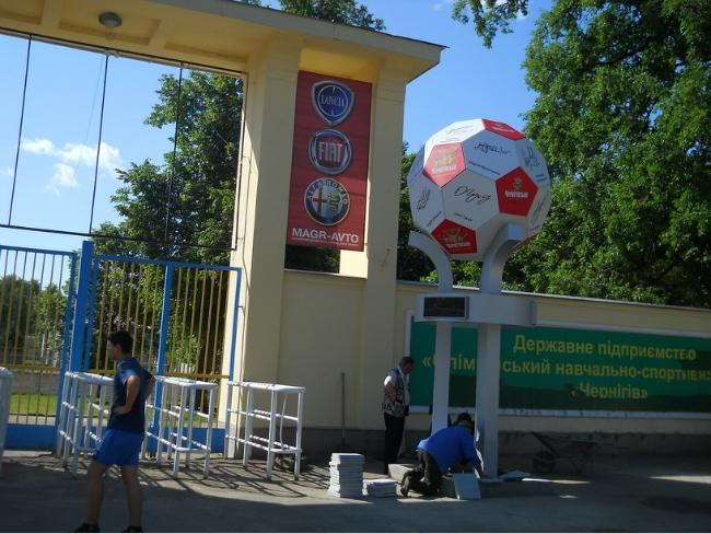 Самый большой футбольный мяч Чернигова, да, наверняка, и области, поставили снаружи стадиона возле входных ворот.