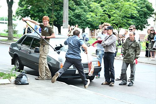 — це зйомки крутого ДТП, коли під колеса автомобіля потрапляє один з головних героїв картини (московський актор Віктор Супрун), у результаті чого «влітає» у переднє скло. Таким чином весь його тулуб у машині, ноги стирчать з вікна, а пляшки горілки з заднього сидіння цього автомобіля випадають прямо на бруківку, розбиваючи при цьому капот машини, що проїжджала повз. До речі, обуреного водія, хазяїна побитого капота, зіграв директор картини Ігор Єгоров.