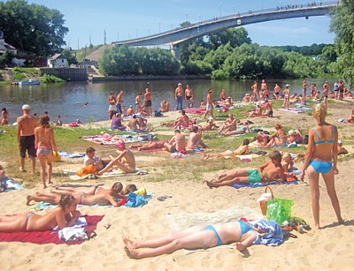 Пляж за пешеходным мостом. Переходя на другой берег Десны, можно увидеть, что пляж этот раскинулся по обе стороны пешеходного моста. Место это популярное, многие приходят сюда, чтобы не искать себе свободного местечка на «Золотом берегу», хотя и тут людей не меньше.