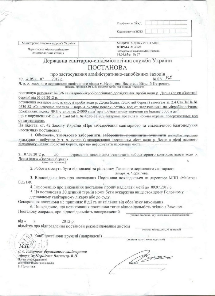 З'ясувалося, що розглянувши результат санітарно-мікробіологічного дослідження проби води р. Десни від 05.07.2012, в.о. головного державного санітарного лікаря м. Чернігова Василець Віталій Петрович встановив невідповідність якості проби води р. Десна (пляж «Золотий берег») вимогам санітарних правил за мікробіологічними показниками: індекс ЛКП становить 24 000 в дм куб. при нормі не більше 5 000! Саме тому з 07.07.2012 в.о. головного лікаря своєю Постановою тимчасово заборонив купання «до отримання задовільних результатів лабораторного контролю якості води р. Десна».
