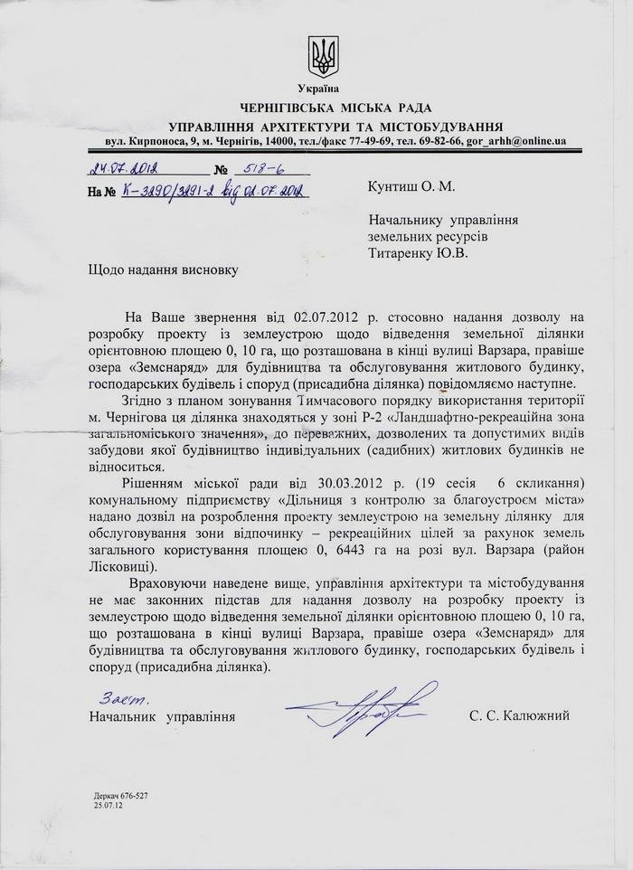 Не минуло й місяця, як одна за одною надійшли 4 відмови від Управління архітектури та містобудування Чернігівської міської ради. Зокрема, в них зазначалося, що обрані землі знаходяться в зонах, в яких не передбачено індивідуальне будівництво: