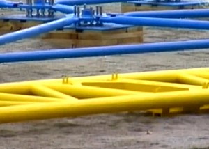 Тут же лежат желтые «пути» — по ним и будет ездить аттракцион. Работники ходят между труб, что-то подкручивают, сверяют с чертежом.