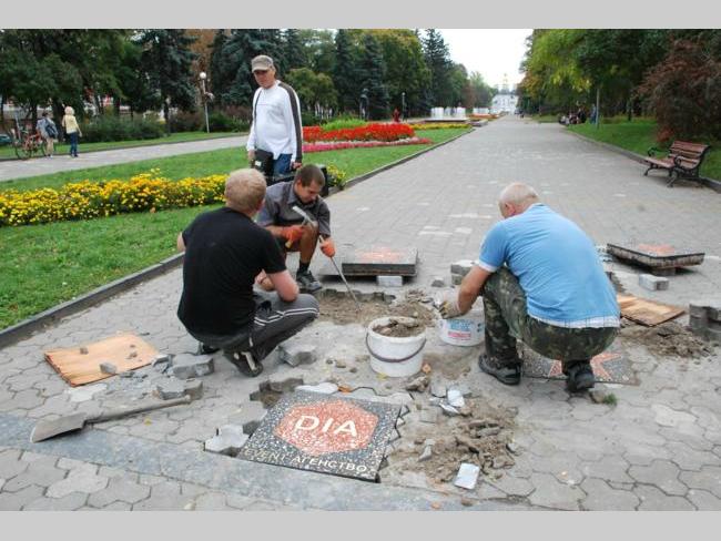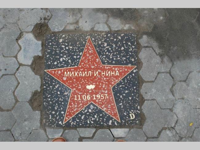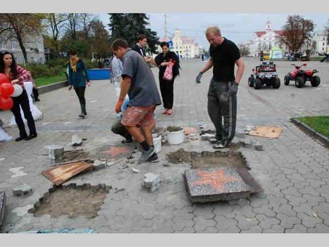 Вынутую в нескольких местах брусчатку заменили черно-красные плиты с изображением звезды и золотыми надписями: «Нина и Михаил», «Халик и Вика», «Руслан и Татьяна»... По форме они со старой брусчаткой не совпадают - так что по краям остались забитые землей и мусором выбоины. В некоторых надписях буквы «отзеркалены», в слове «агентство» пропущена буква «т». Прохожие останавливаются в недоумении. Что это значит? Кто это сделал? И кто разрешил?
