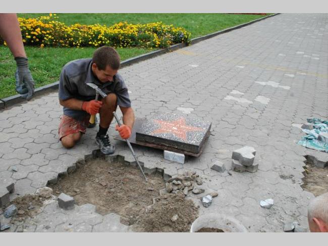 То, что вы сейчас видите на аллее, - это фактически черновой вариант, сделанный за одну ночь. Плиты будут вмонтированы капитально уже к концу этой недели. А новую брусчатку, видимо, будем укладывать уже весной, чтобы за зиму она не просела - так мне предложили в управлении архитектуры. В любом случае нужно будет на это получить разрешение. Скользкими плиты не будут: мы шлифуем только сами звезды, а остальная часть плиты останется шероховатой.