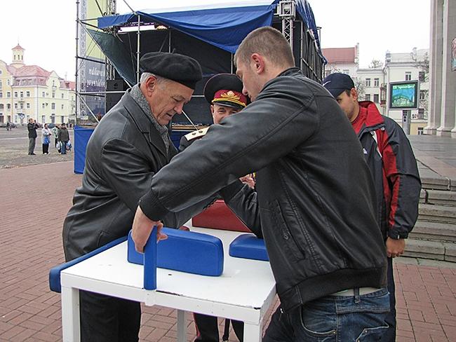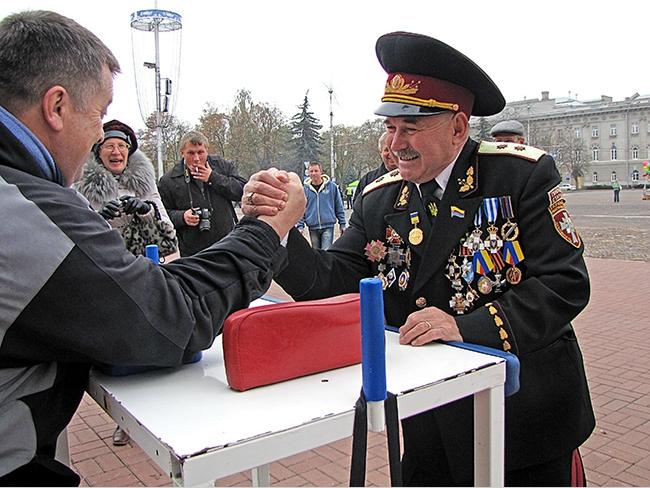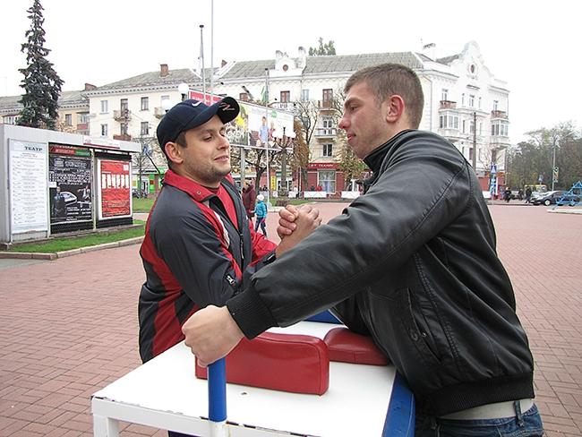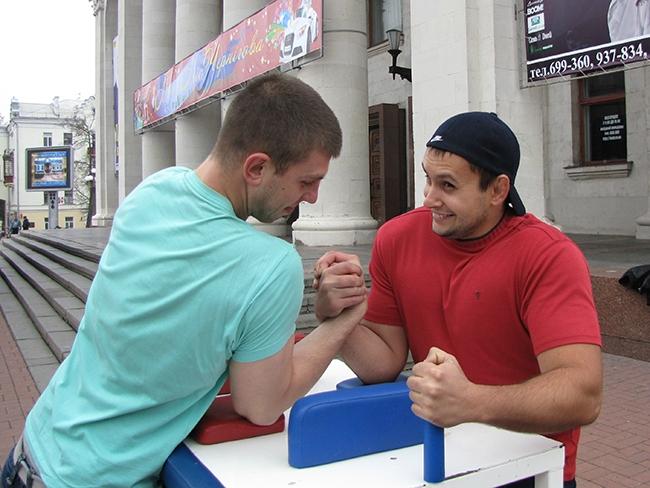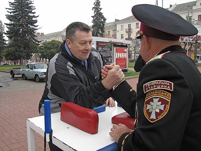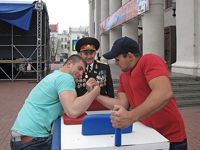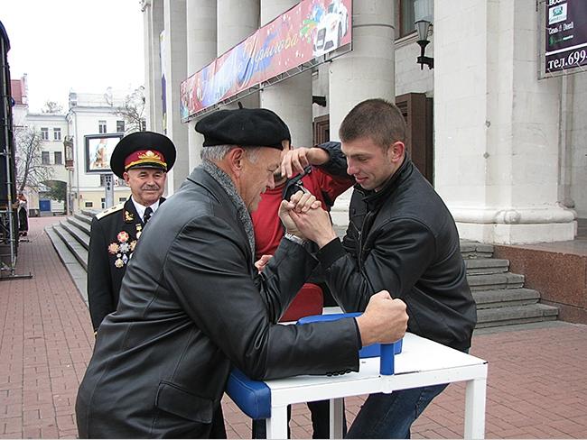 А рядом со сценой, казаки устроили развлечение — на столе для армрестлинга проходили поединки борьбы на руках. Продемонстрировал свою недюжинную силу и казачий генерал — Петр Лобас, а сила рук начальника городского управления культуры Олега Васюты, вызвала восторг и аплодисменты зрителей.