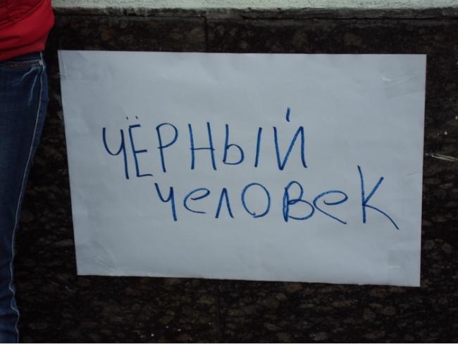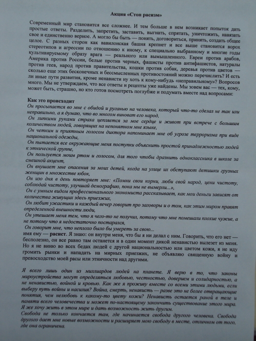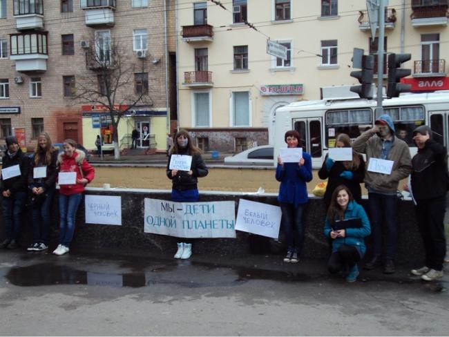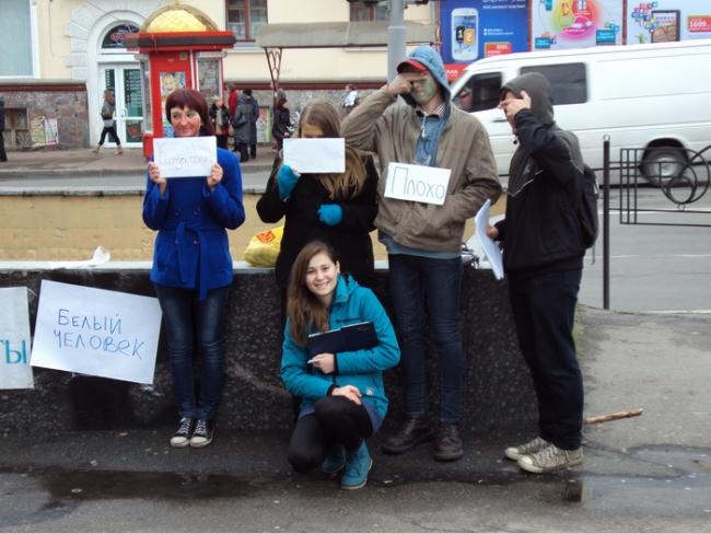 "В интернете есть видеоролик под названием «Расизму не место в футболе». Видеоролик направлен против расовой дискриминации. Мы интерпретируем этот ролик и пытаемся обратить внимание людей на проблему. Расизм по отношению к черному человеку – это очень глупо. Мы не представляем никакой партии либо общественной организации. Мы - инициативная группа молодежи, которая решила добровольно и по собственному желанию провести подобную акцию. Среди нас есть как школьники, так и студенты. Практически все мы знакомы между собой, поэтому собраться не представляло особой сложности. Наши лица окрашены в разные цвета: красный, желтый, зеленый, синий, серый. Это символизирует белого человека, о котором рассказывается в видеоролике.