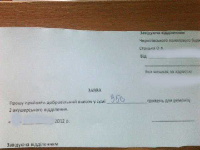На его просьбу дать реквизиты ему ответили, что так платите, под роспись в тетрадке, что реквизиты только у заведующего, а были выходные и его не было, реквизитов тоже... Потом, в день выписки, ко мне подошла медсестра и уже спокойно, без наездов, попросила оплатить этот взнос, объясняя это тем, что заведующему доложат, что ко мне ходили в палату без оплаты взноса, и у нее будут проблемы. Что их заставляют "выбивать" эти взносы, хоть ей очень и не удобно это делать.... И говорит, что действительно они как-то подбивают там суммы, и заведующий говорит: вот эта сумма туда-то пойдет, эта туда-то. В общем, пожалела я ее и отдала эти 200 гривен.
