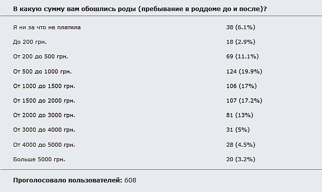 А вот выдержки из отзывов рожениц и результаты голосования 608 человек, с черниговского форума http://rebenok.cn.ua в темах «Благодарность медперсоналу» и «Стоимость родов»