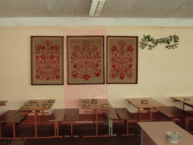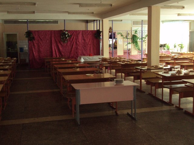 Следующий пункт назначения – столовая. В 11-м коллегиуме она большая и просторная. Во время ревизии столовой как раз накрывали на стол. Тарелки были чистые, столы протерты. Обнаружил всего пару тарелок со сколами, но их сразу заменили на новые. Еще мне удалось узнать, что помимо гранита науки грызут ученики 11-го коллегиума.