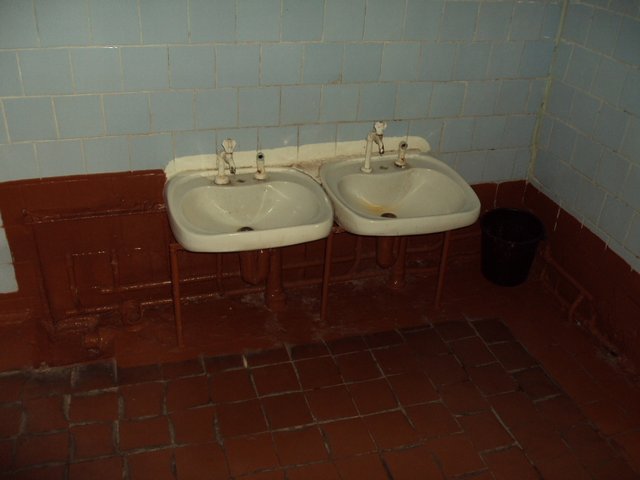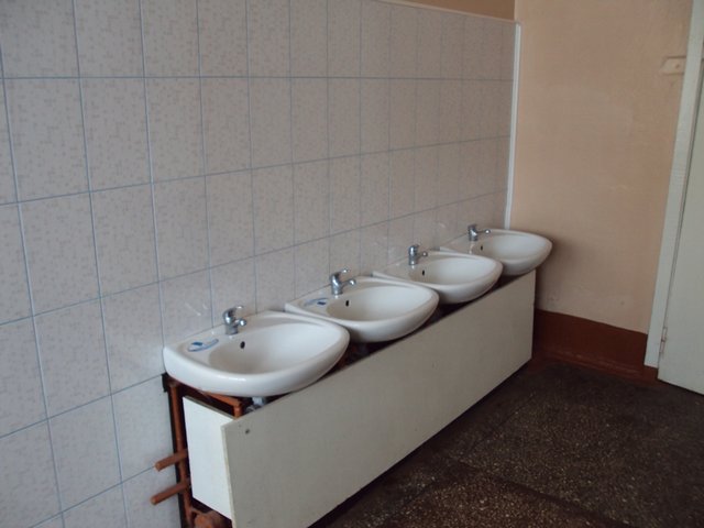 Сразу на выходе из столовой, с правой стороны, расположено 9 умывальников со смесителями. Все находятся в рабочем состоянии. Очень удобно, так как дети могут вымыть руки, как перед едой, так и после. Когда проверял смесители, то вспомнил знаменитую фразу Ипполита из кинофильма «Ирония судьбы или с легким паром»: «О, тепленькая пошла»! Обычно такую роскошь, как теплая вода, многие школы себе позволить не могут.