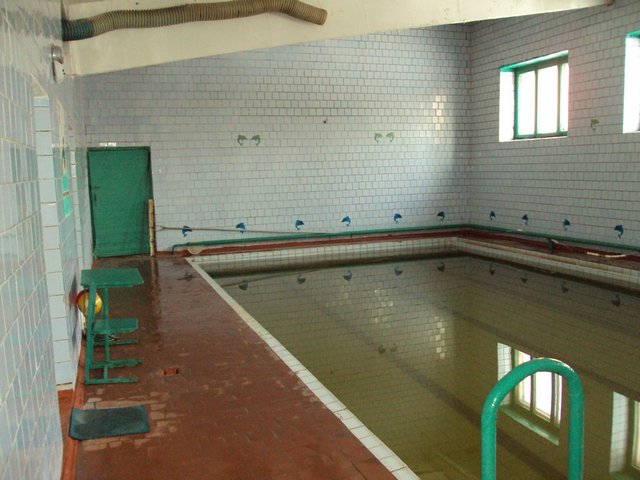 Так же как и в спортзале в бассейне имеются проблемы с потолком. Влага не щадит ничего, поэтому куски побелки, отслаивающиеся от потолка, постепенно отваливаются в воду. Директор коллегиума Рубан Светлана Васильевна пояснила, что ремонт потолка в бассейне планируется на лето 2013 года.