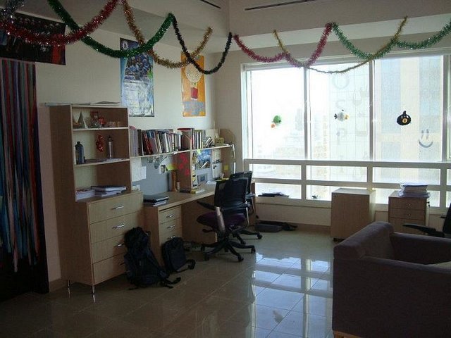 Наш гуртожиток назвати гуртожитком дуже важко. Під нього виділено 10 поверхів 45-поверхового чотиризіркового готелю. Кімнати є для двох і чотирьох студентів. Ми живемо втрьох у чотиримісній кімнаті, сусідки - українка та росіянка. Маємо власні вітальню, кухню, дві спальні, дві ванних кімнати.