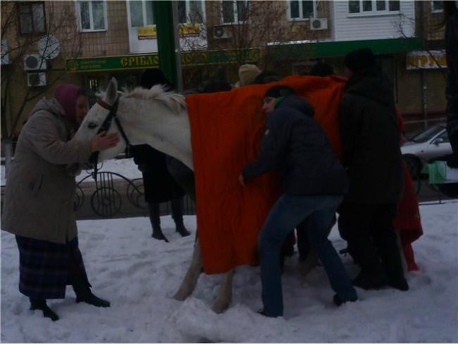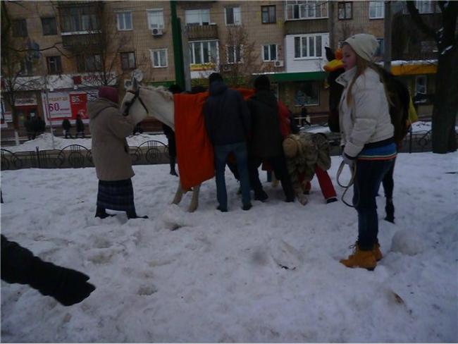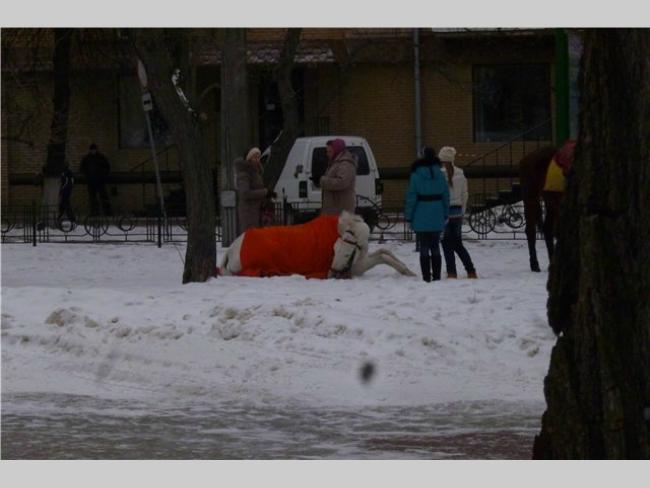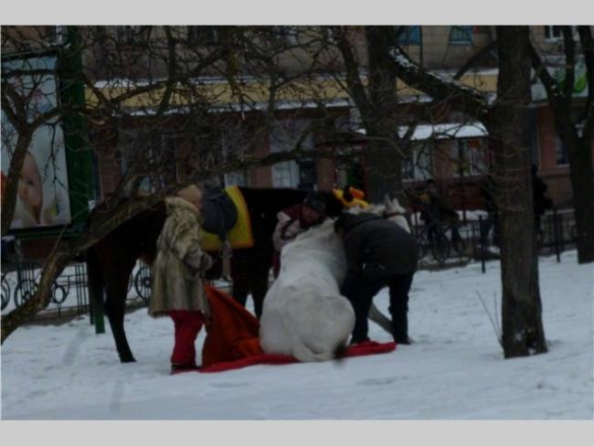 7 января в центре города Чернигов произошло следующее событие - упала лошадь. Лошадь принадлежит так называемому "Конно-спортивному клубу Элинор". Причина её падения: истощение и неразумное катание на ней по льду.