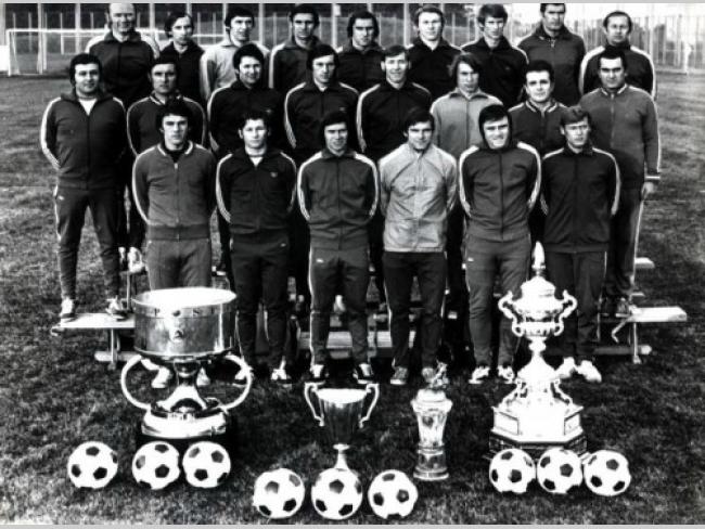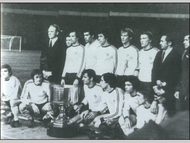 1975 год. Анатолий Коньков и Михаил Фоменко (слева) с чашей Суперкубка УЕФА