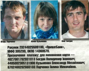 Из самых простых коробок из-под продуктов мы сделали ящики для пожертвований. В самых людных местах: в магазинах, банке, на почте повесили плакаты с фото ребят о просьбе помочь. Расклеили банковские реквизиты родителей. За первый день собрали около девяти тысяч гривен. Мама Игоря говорила, что в день нужно тратить около трех тысяч на каждого.