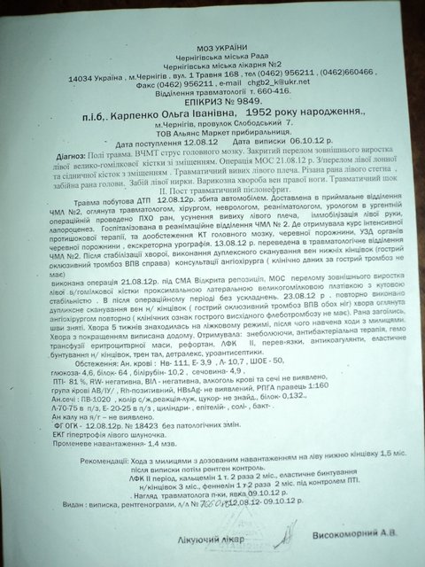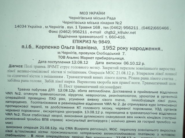 Жена пострадала меньше, чем мать и осталась живой. Два месяца пролежала в Черниговской городской больнице № 2 с 12 августа 2012 (поступила) и до 6 октября 2012 (дата выписки) с диагнозом закрытая черепно-мозговая травма, сотрясение головного мозга, переломы левого бедра и левого плеча, раны головы, грудной клетки и ног. Лечащий врач – Высокоморный А.В