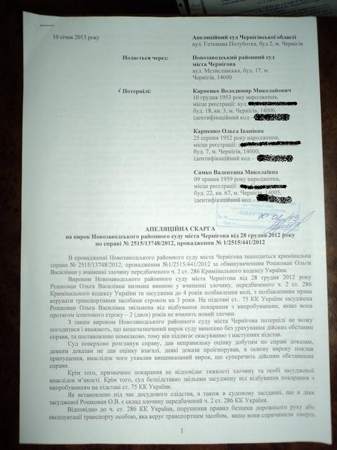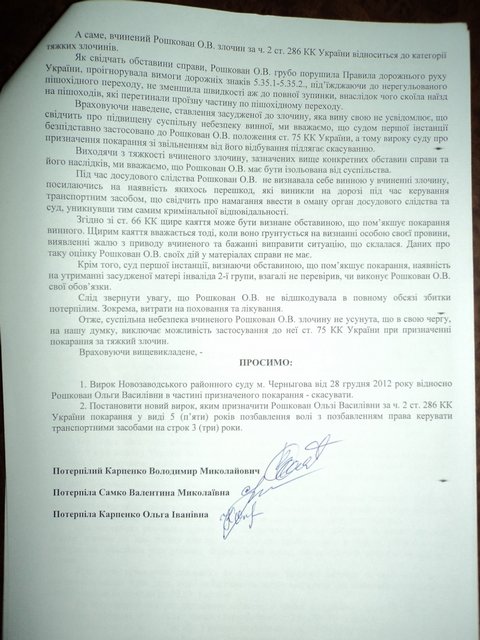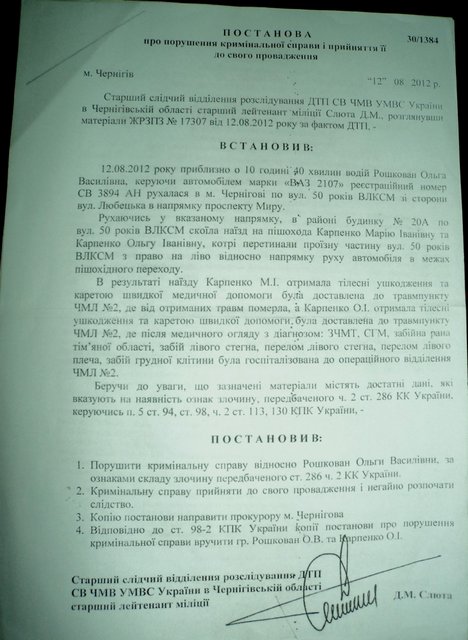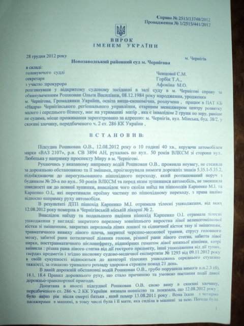 Напомним, что утром 12 августа 2012 года в Чернигове возле дома № 20а по улице 50 лет ВЛКСМ произошло дорожно-транспортное происшествие с участием автомобиля «ВАЗ-2107» под управлением 28-летней Рошкован Ольги Васильевны. Транспортное средство двигалось по улице 50 лет ВЛКСМ в направлении проспекта Мира и на пешеходном переходе совершило наезд на двух человек. В результате аварии погибла пенсионерка Карпенко Мария Ивановна 1928 года рождения, а ее 60-летняя невестка (тоже пенсионерка) Карпенко Ольга Ивановна получила телесные повреждения и была госпитализирована в операционное отделение Черниговской городской больницы № 2. В этот день женщины направлялись за покупками в супермаркет «АТБ».