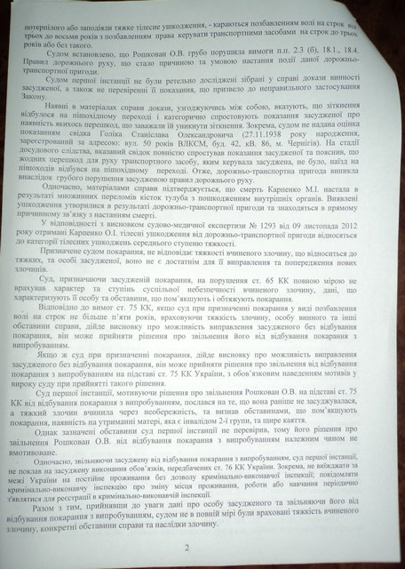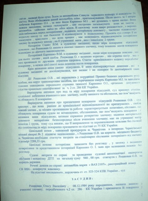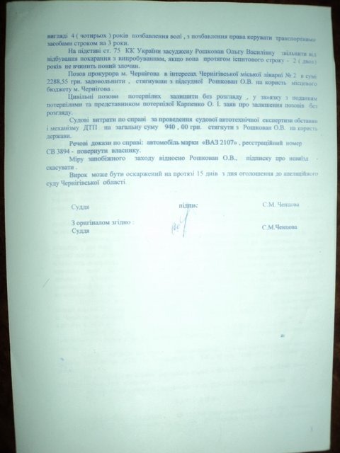 Судья отнеслась неадекватно к данному делу. Вынося приговор, она не смотрела материалы уголовного дела и экспертизу. Даже на показание свидетелей она не ссылалась. А приговор вынесла на основании ст.75 УК Украины только со слов виновной Рошкован Ольги Васильевны. Еще и автомобиль вернули обратно владельцу.