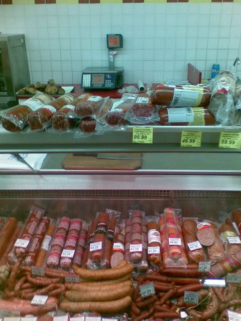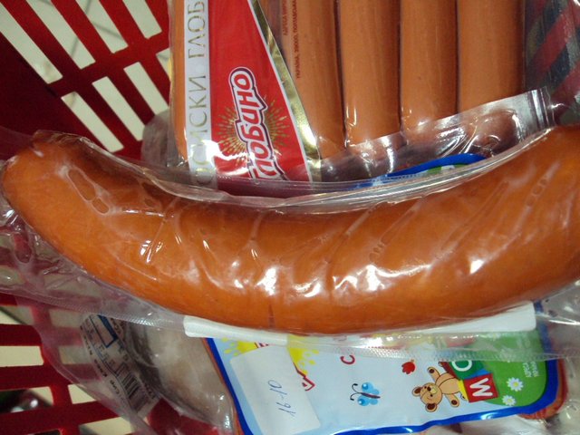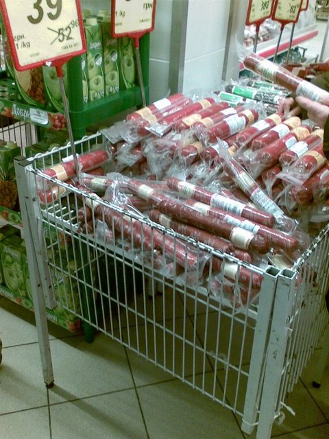 Эту колбасу уже пора бы снимать с прилавка, так как срок годности ее почти уже истек. А ее наоборот  выложили на видное место.