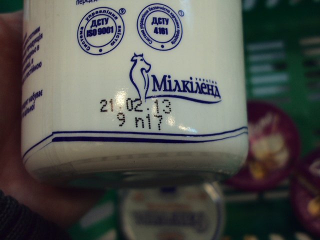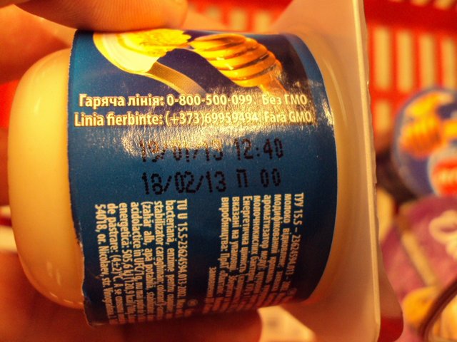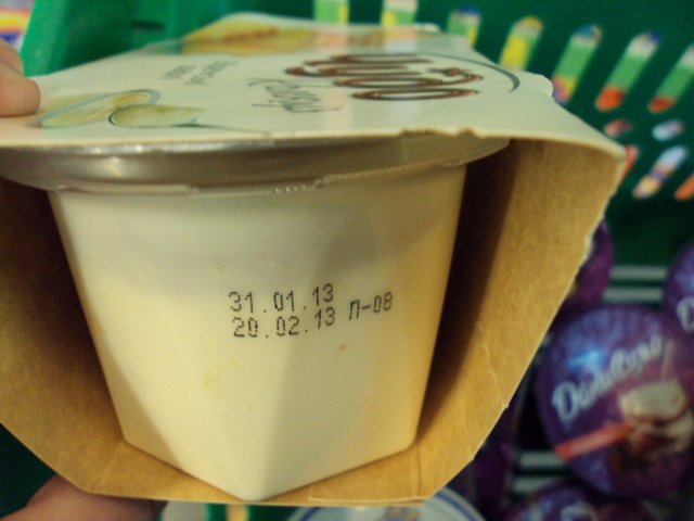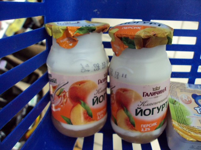 Обратите внимание на йогурт, который справа. Я специально поставил нормальный йогурт рядом, чтобы можно было увидеть разницу. Как видите, защитная крышка на йогурте – вздулась, а это значит, что продукт  –  испорчен.