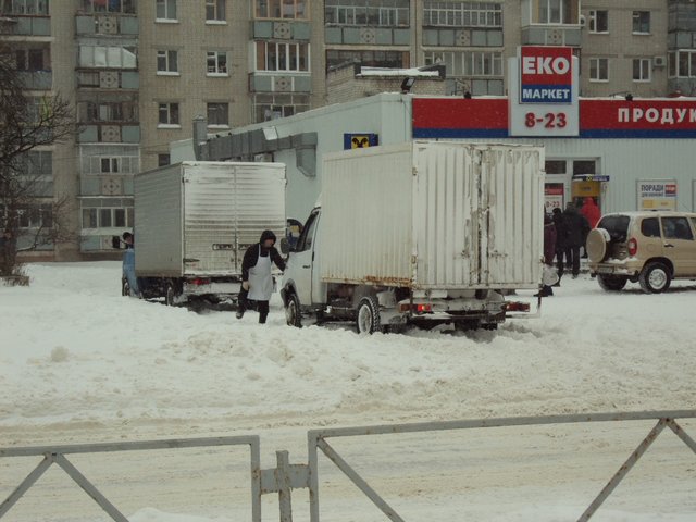 Также в последние 2-3 дня на дорогах повсеместно можно встретить автомобили, которые увязли в снегу. Как, например, этот автомобиль с продуктами питания.