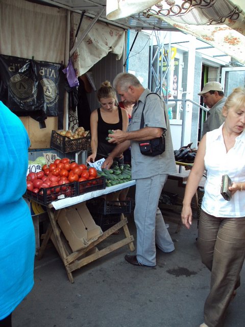 Я, естественно, «наведался в гости» и к продавщице помидоров, но ее к тому времени на месте уже не было. Она в черной майке на фото, торгует слева от молочного павильона и также как и у продавщицы черешен ее весы не отрегулированы.