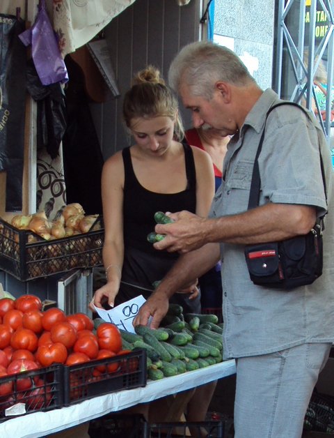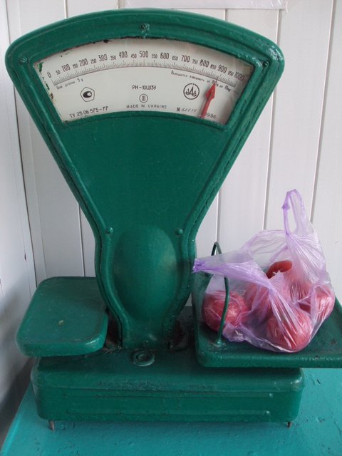 Помидоры – 10 грн. за 1 кг. За 1,205 кг помидоров я отдал 12 гривен.
