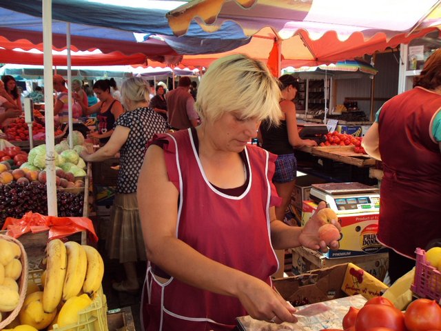 Вот она, дама, с неправильно настроенными весами. Если, в среднем через нее проходит 20-30 покупателей черешни, каждый из которых взял ее по килограмму, то сумма по обвесу только на этом товаре составляет от 140 до 210 грн. в день. А ведь у нее на прилавке, как видите есть еще помидоры, бананы, лимоны и прочее.
