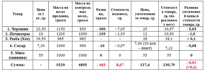 Реальная стоимость недовеса в денежном эквиваленте (6,61 грн.) отличается от теоретической стоимости (8,67 грн.). Это связано с тем, что при реальной торговле продавцы, которые обманывали, немного занижали стоимость, поэтому соотношение недовес/переплата не точное.