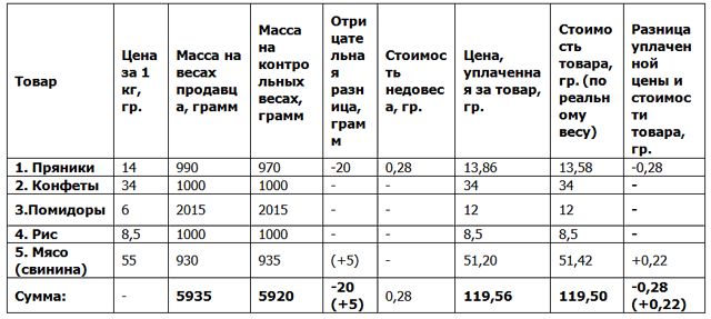 Полученные результаты контрольной закупки я сгруппировал в таблицу.