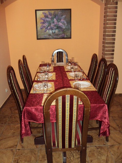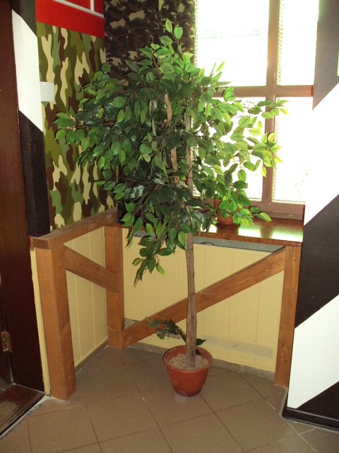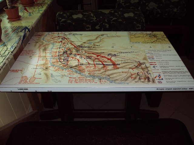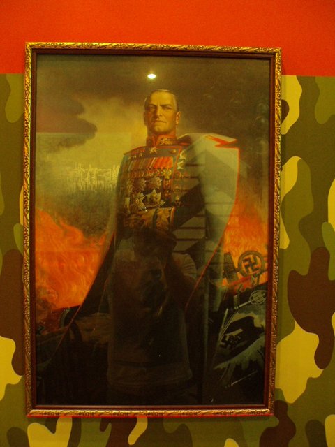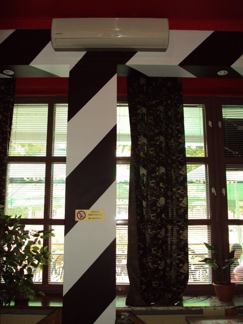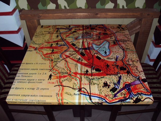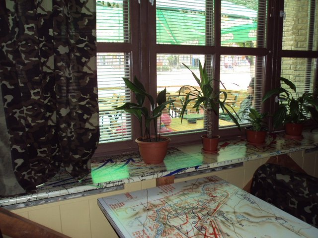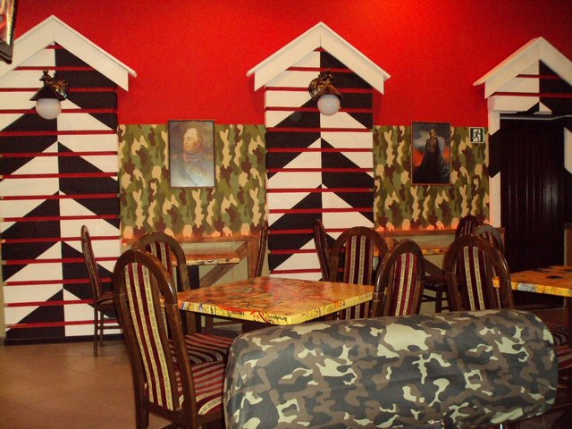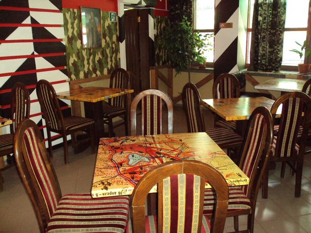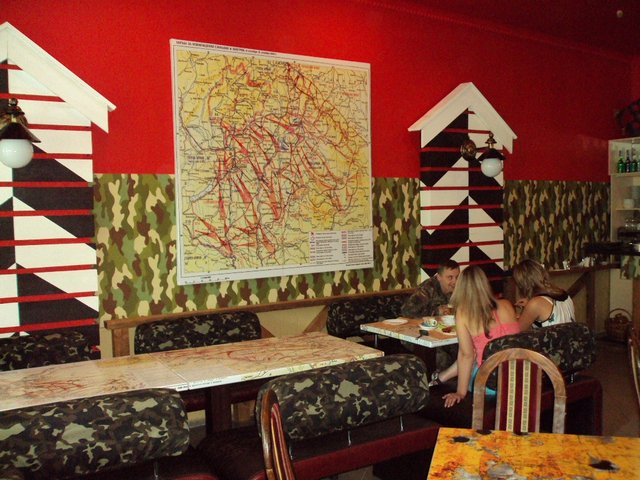 Что касается мебели, интерьера и посуды. Здесь сложнее, так как деревянные стулья, в отличии от диванов, обтянутых тканью расцветки "хаки", скатерти на столах и сервировочные салфетки, скорее всего достались "Штабу" по наследству от его предшественника - "Гурмана", и мягко говоря не совсем соответсвуют направленности военного штаба. Стандартная посуда белого цвета, которую можно увидеть на раскладках любого современного супермаркета, также вряд ли была на столах военных прошлых лет. Ее бы лучше заменить на металлические изделия. Ну и навряд ли из стаканов "Кока-Кола" доводилось пить узвар военным первой или второй мировой.