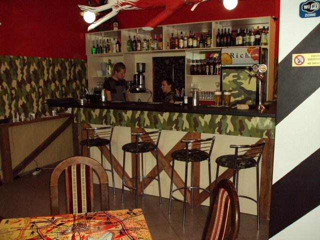 После того как мы зашли в «Штаб» с нами сразу же поздоровались официант и бармен, которые были в камуфляжных футболках, и предложили нам присесть на диван. Мы еще не успели снять верхнюю одежду (был дождь и холодная погода, поэтому пришли в куртках), как нам оперативно принесли два меню и положили их на стол.