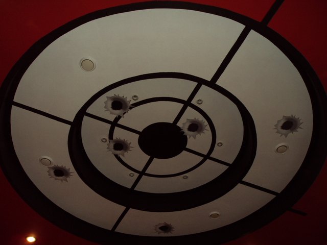 На потолке в «Штабе» нарисована огромная мишень с такими же нарисованными пулевыми отверстиями.