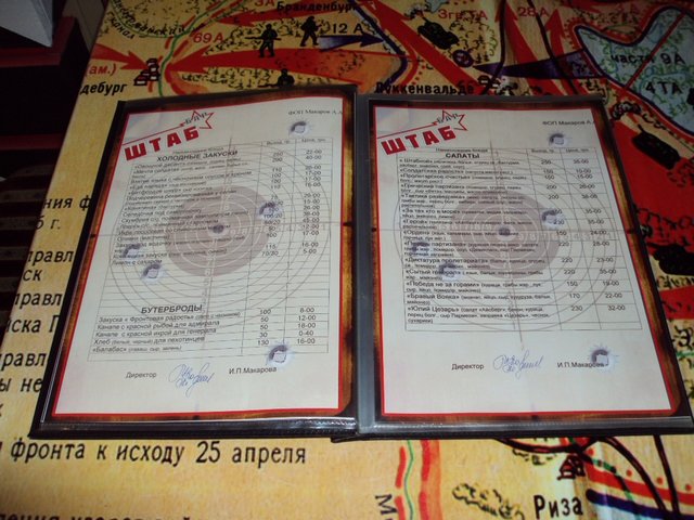В целом, визуально в баре чисто, столы протерты, пол вымыт, пыли или грязи я не заметил. Если говорить об интерьере, то в баре «Штаб», на мой взгляд, не хватает какой-то реальной военной атрибутики, благодаря которой можно проникнуться духом военного времени. Возможно, это будут муляжи оружия времен ВОВ, развешенные на стенах, военная униформа, газеты или просто какие-то бытовые предметы, которыми активно пользовались в военные годы. Особый интерес посетителей бы вызвала какая-нибудь монументальная изюминка, например пулемет «Максим» или что-то в этом роде. В данном же варианте бар больше напоминает модерновое заведение. Хотя, возможно, все так и было задумано.