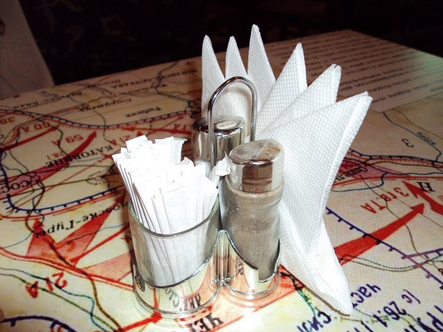Спустя пару минут после того как официант принял заказ нам принесли специальные коврики и приборы, завернутые в салфетки. Также на стол поставили подставки с солью, перцем, зубочистками и салфетками.