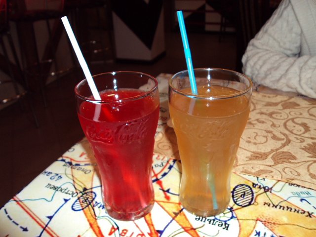 Примерно в течение 3-5 минут нам принесли напитки: морс и узвар, вот в таких стаканах из под Кока-Колы, с кокетливыми пластиковыми трубочками для коктейлей. Хотя, на мой взгляд этому заведению подошли бы больше граненые стаканы, или что-то более отвечающее военной тематике.